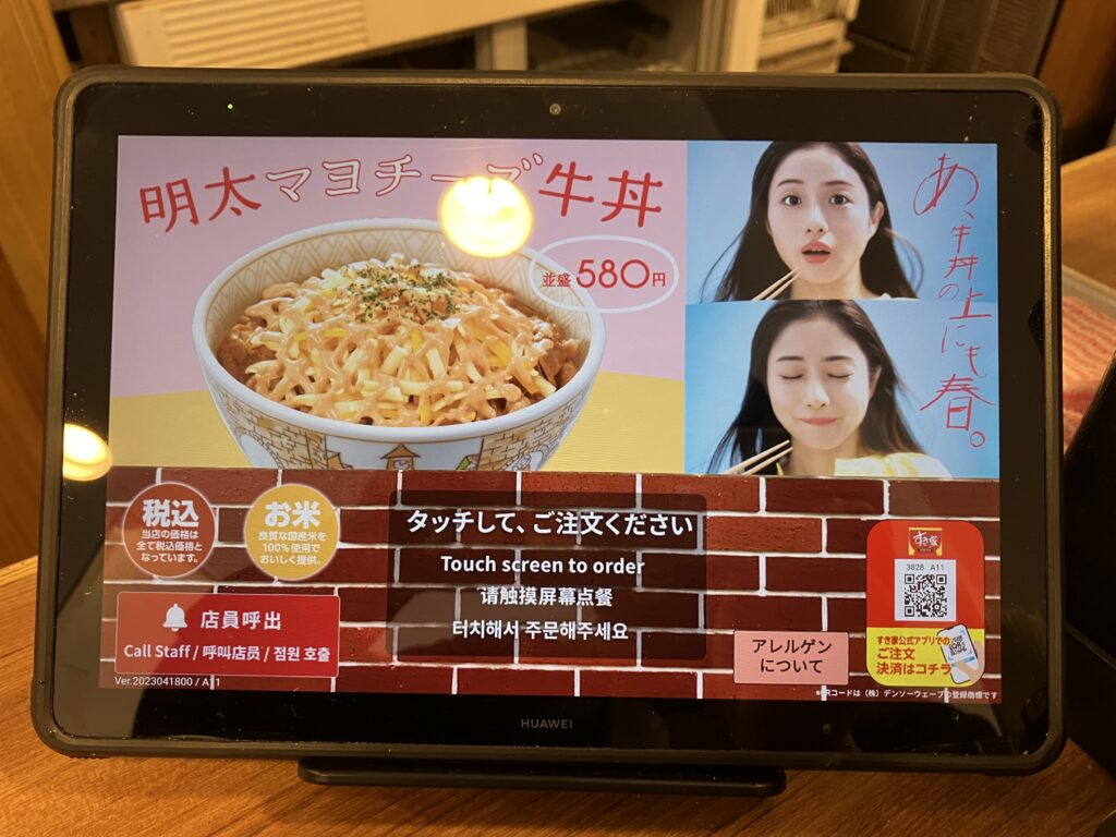 Gyuudon is one of the most typical fast foods in Japan. It probably has the same number of stores as McDonald’s. Sukiya, which I often visit, is also crowded with many customers, especially at lunchtime, but it may be a bit difficult for those traveling from overseas to use. Because the store is compact, it is difficult to enter if you are carrying a large bag or trunk, and ordering is done using a tablet, which may be confusing if you do not know how to use it. However, gyudon is inexpensive, freshly prepared, ready-to-eat, and delicious. In this article, I will show you how to order a gyudon.