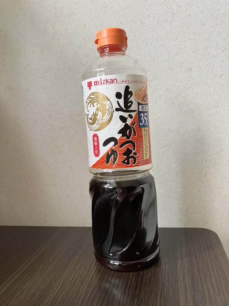 This is dipped in soup and eaten. It is called men-tsuyu. Mentsuyu is a seasoning that is stocked in Japanese kitchens. I think it has the same status as soy sauce, salt, miso, etc. This men-tsuyu is diluted with water. Use a 1:1 ratio of water to mentsuyu. It is difficult to describe the taste of mentsuyu in words. It is colored like soy sauce, but not as salty as soy sauce, and has a dashi taste. In addition, this mentsuyu can be enjoyed either warm or cold.