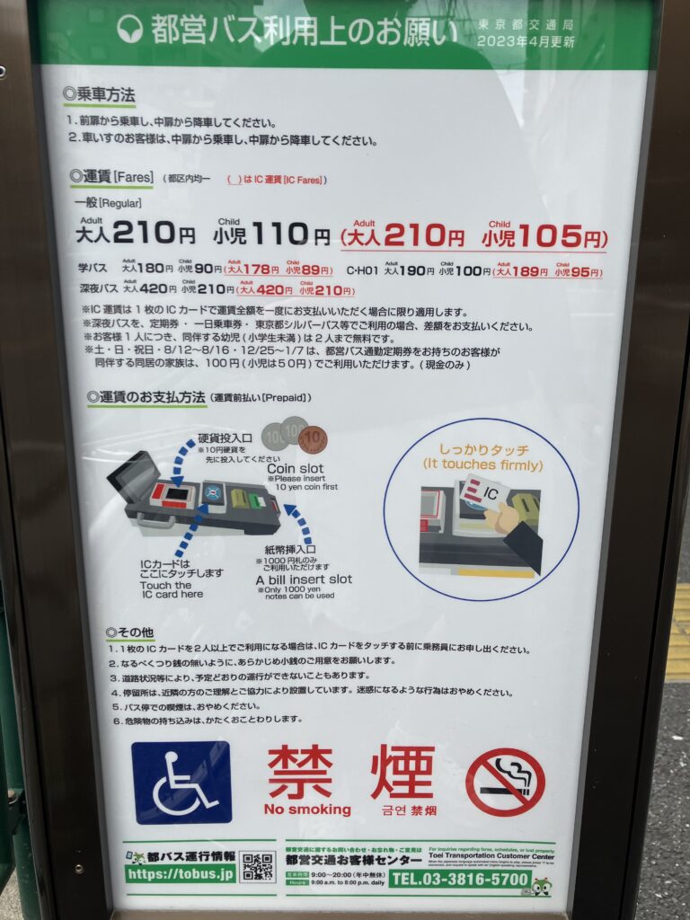 I am Kimura, living in the northern part of Tokyo. I was taking a walk and somehow saw a bus stop with a guide on how to use the bus. If you come to Japan from overseas and travel around Tokyo, you will basically take a train or a cab. But as a transportation network, buses are cheap. If you have a route to take to your destination, this should be one of your options. If you want to see the scenery of a Japanese city, a bus window is not a bad idea. Today I will briefly introduce how to ride the Toei buses, although it is very simple.