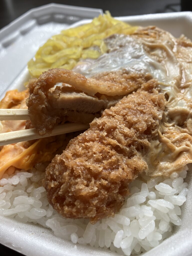 Remove the wrapper, open the lid, and you’ll find a bowl of katsudon (pork cutlet served over rice). There was takuan (pickled radish) next to the pork cutlet. Still, the volume is amazing. The bento is heavy.