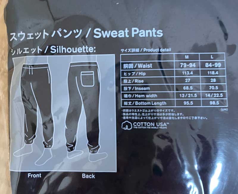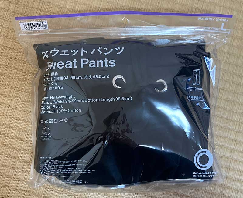 At FamilyMart, these sweatpants are packaged in a clear, compact pack. They’re surprisingly small. I purchased a size L.