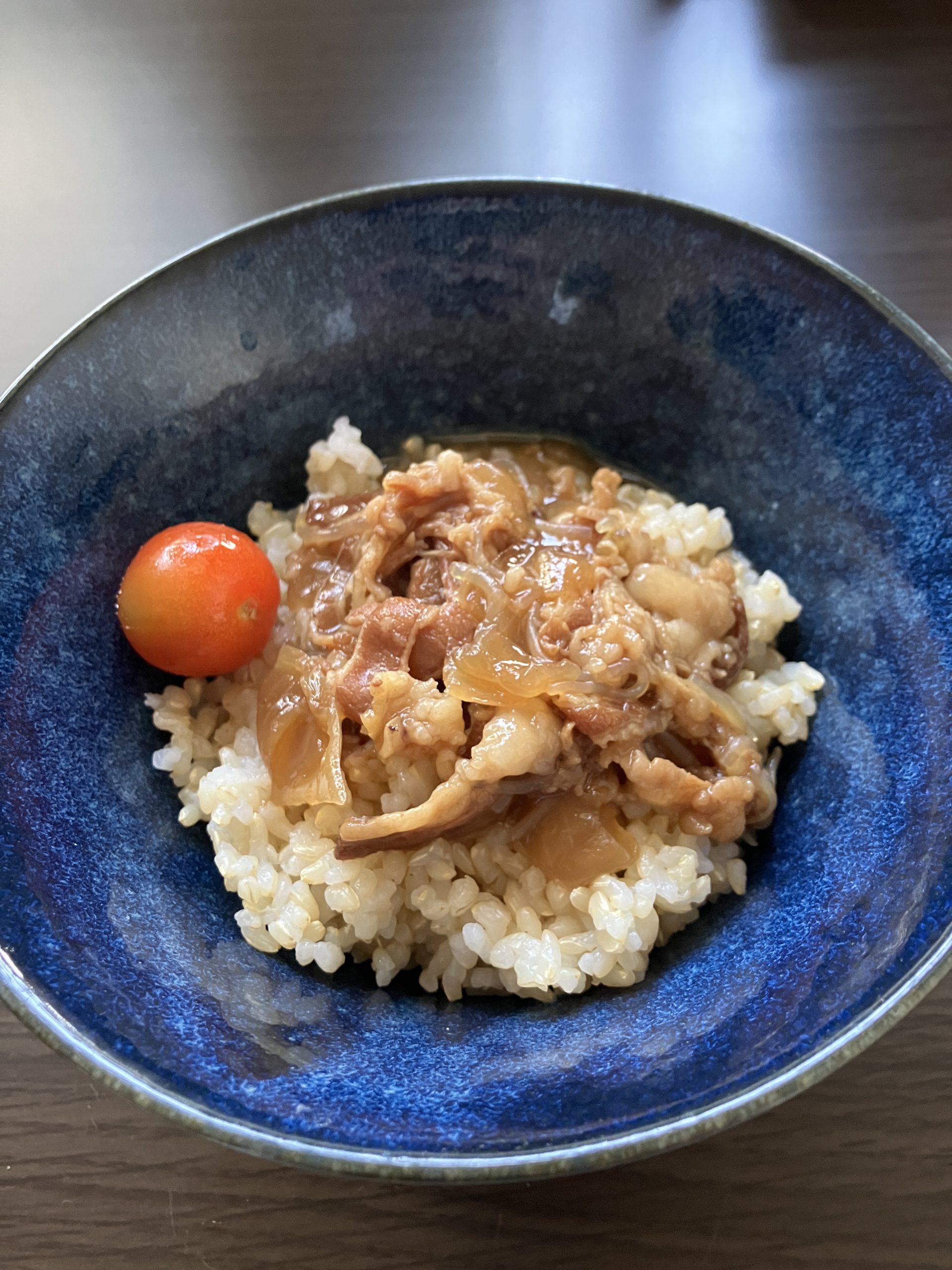 Once heated, simply serve the beef bowl over rice. I added some tomatoes for extra flavor. You might notice my rice looks brown—this is called genmai (brown rice), which is richer in fiber and vitamins compared to white rice. I regularly eat brown rice as part of my diet.