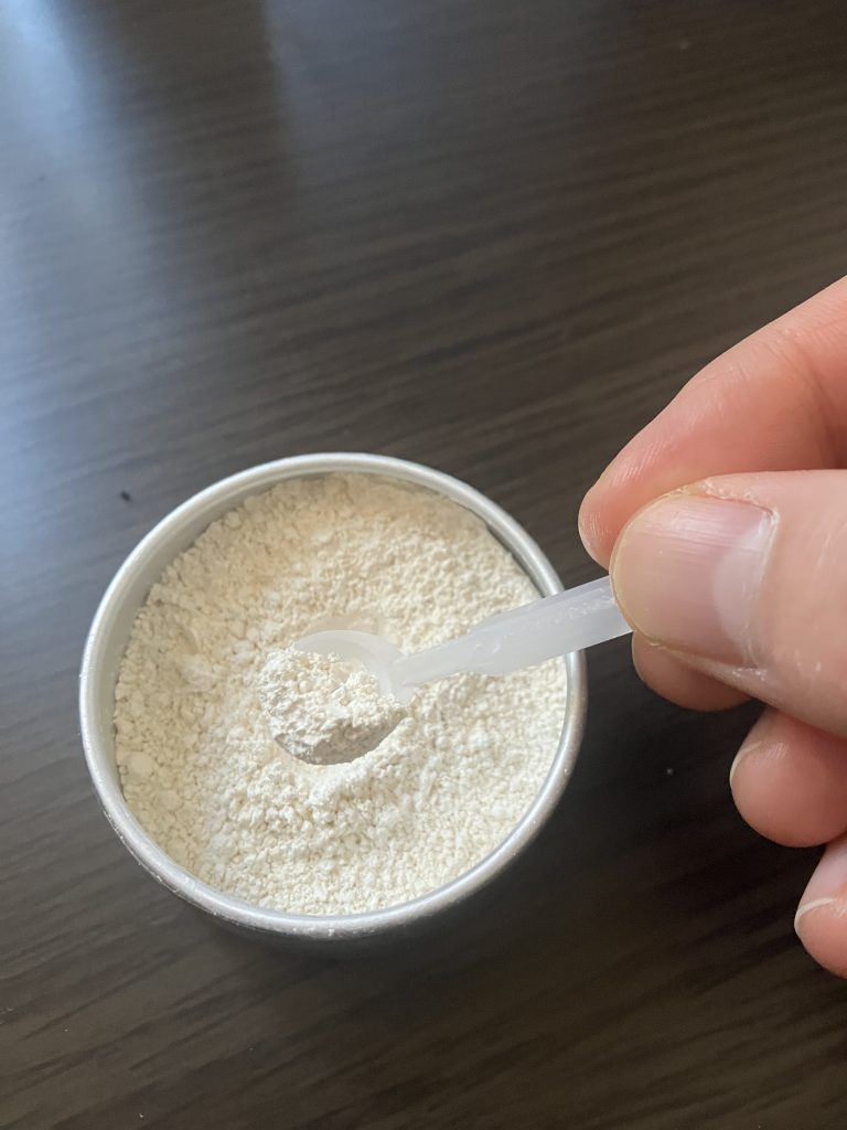 The lid includes a specially designed spoon. For adults, one heaping spoonful is the standard dosage, which equals approximately 0.3 grams.