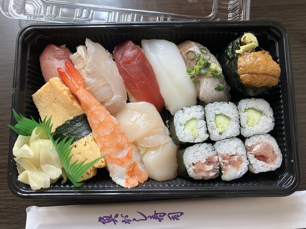 The sushi in the photo is a Jō-Sushi set with an extra piece of scallop (hotate), which I ordered separately. (You can see the scallop next to the shrimp on the right.) Since I opted for takeout, it came in a plastic container, and I enjoyed it at home.